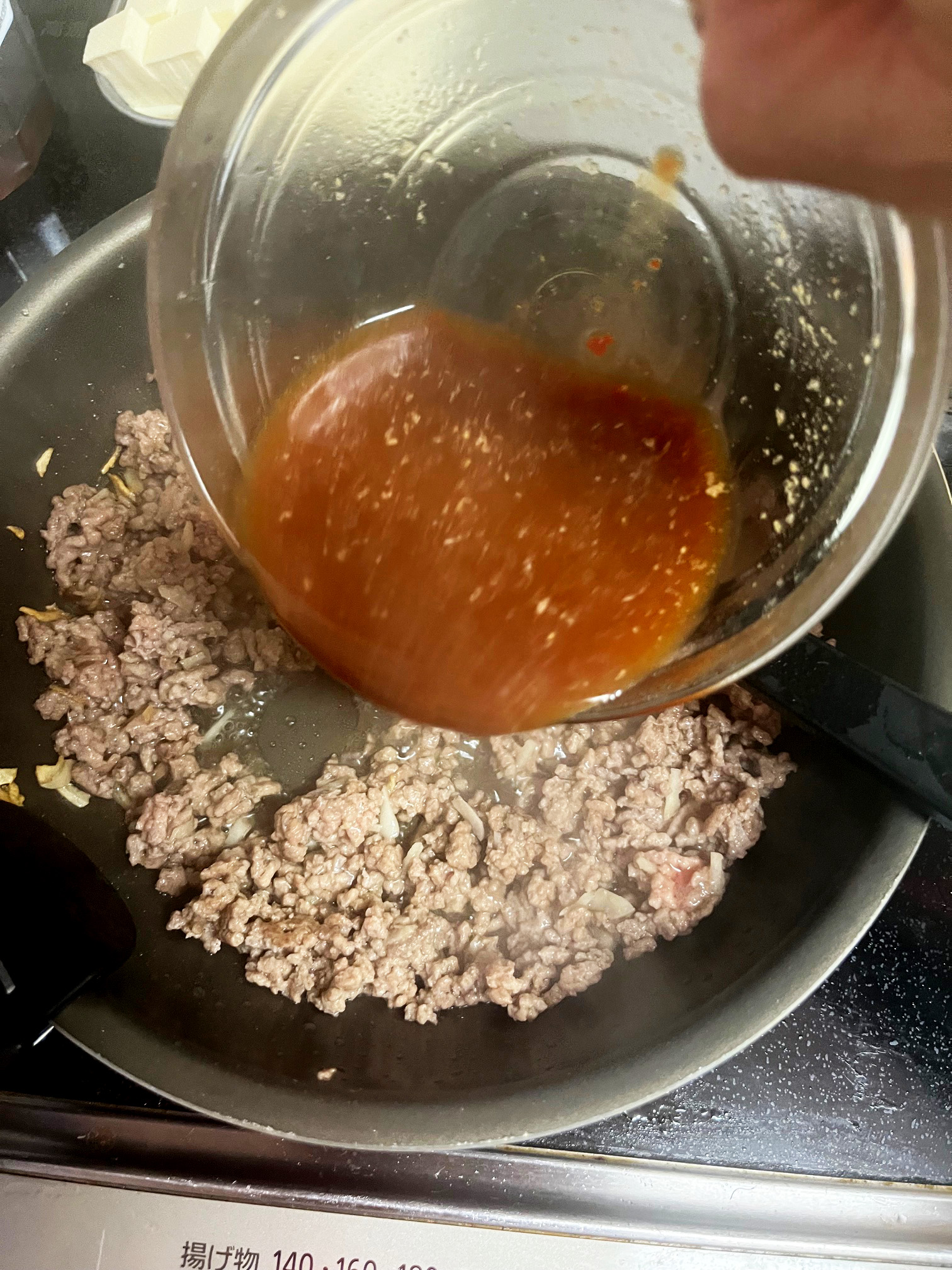 - フライパンにごま油とみじん切りにんにくを入れ、温まったらひき肉を入れて炒める