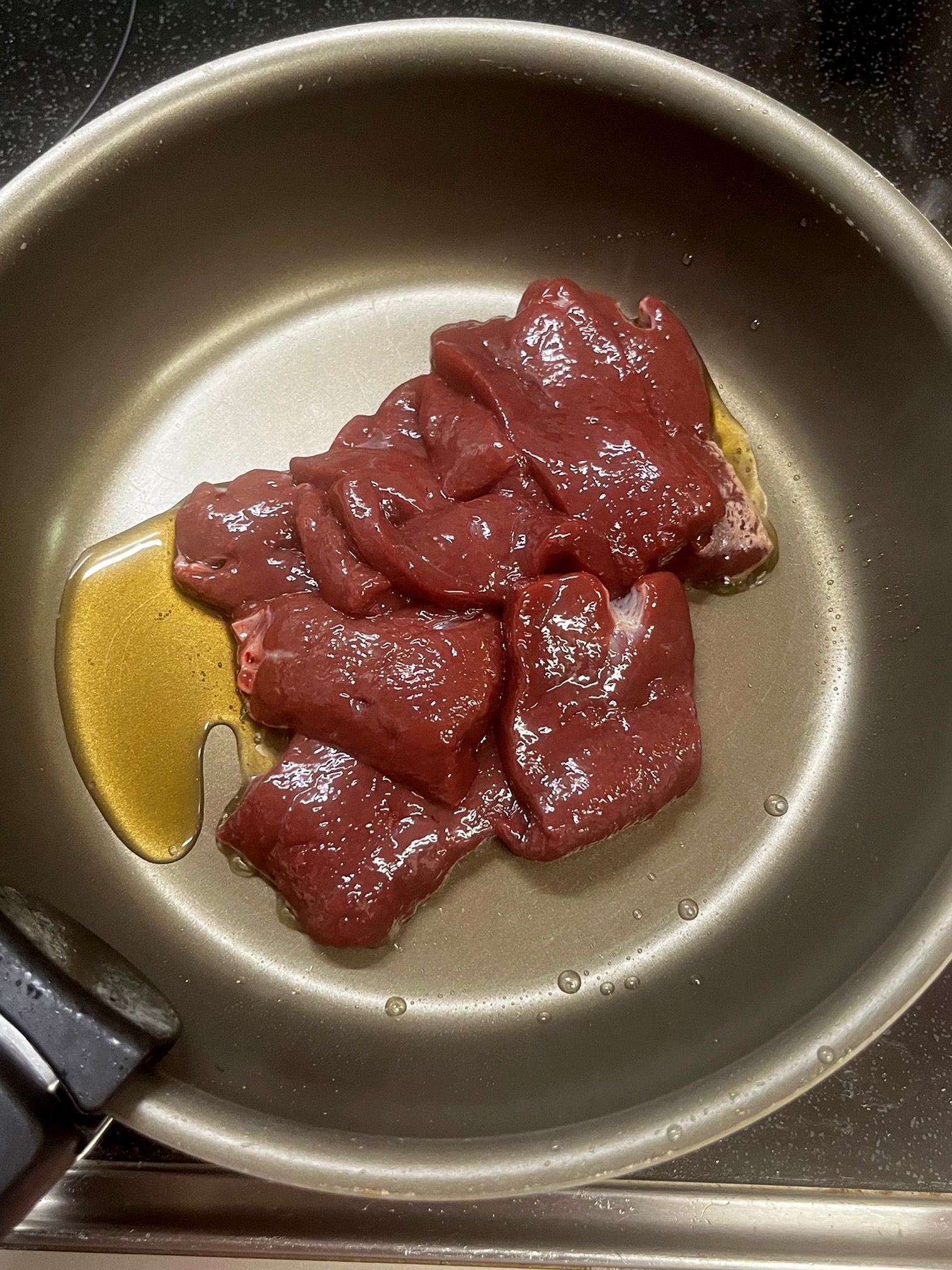 - フライパンにごま油をしきレバーを入れる