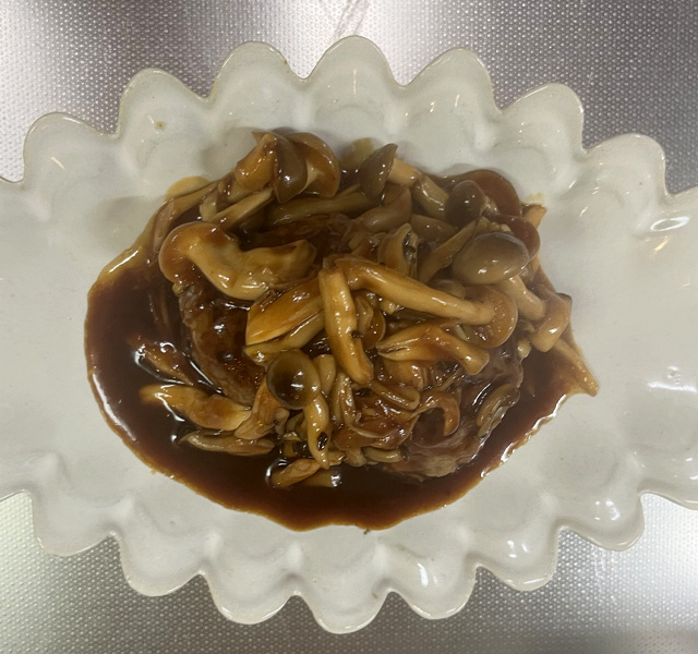 - ハンバーグを焼いたフライパンにつけだれ、ケチャップ、きのこ(お好みで)ソースを作る