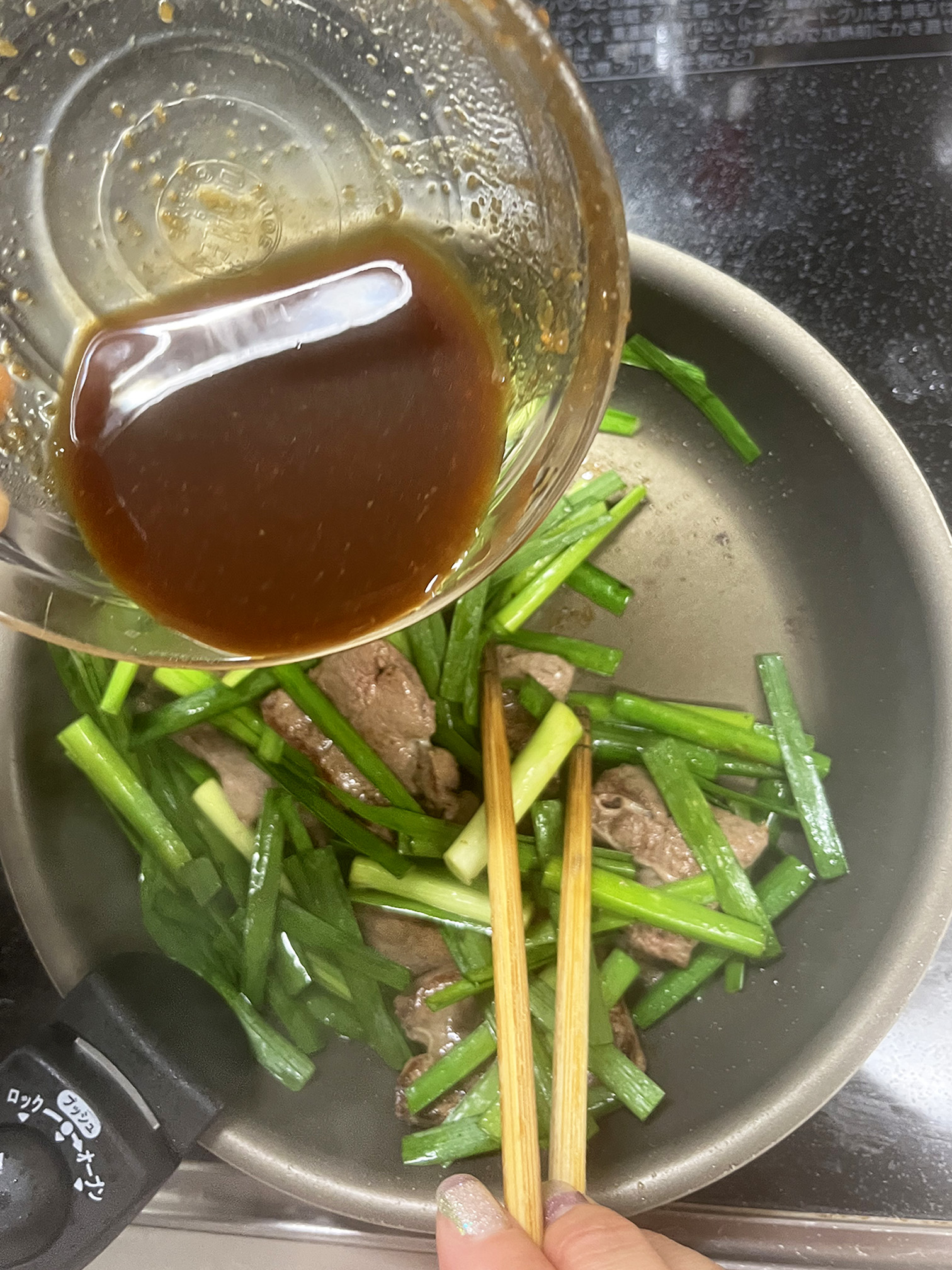 - レバーに火が通ってきたらにらを入れ蓋をして数分おく