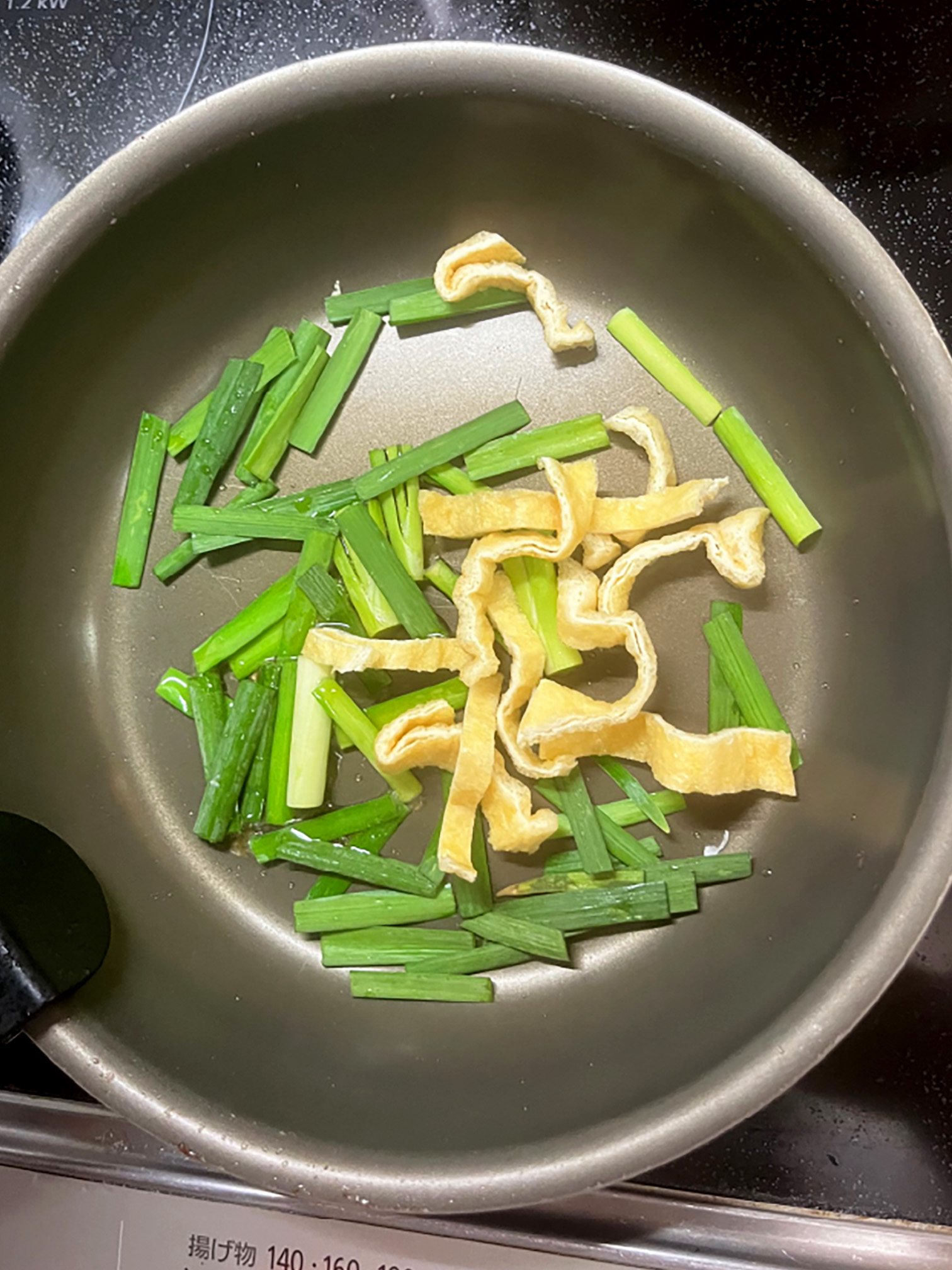 - にらと油揚げをフライパンで炒める